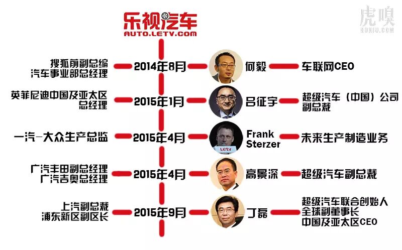 从2015年开始,乐视汽车挖角开始提速。在虎嗅目前收集到的乐视汽车高管中,有一半有外国车企经历。早在2013年3月原华晨宝马营销高级副总裁戴雷加盟英菲尼迪中国时,时任英菲尼迪中国事业部总经理吕征宇就曾公开表示希望加入自主品牌汽车公司,在2012年销量成绩平平的情况下口出此言,姑不论其言论是否得体,如今加盟乐视也算得偿所愿。